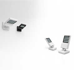 Floor/ wall adjustable spotlight, with LED sources. Materials: floor/ wall support and body in painted aluminium, screen in tempered glass. PMMA lenses - flood optic. Monochrome white LED, 3000K (warm).